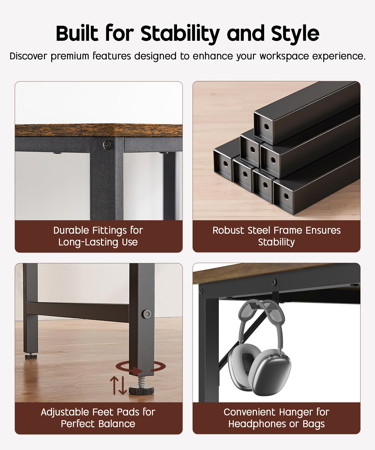 【LONG-LASTING HIGH-QUALITY MATERIALS】 Built with a robust steel frame and durable engineered wood, this desk offers unmatched stability and reliability. Its water and scratch-resistant surface ensures it withstands daily wear and tear, making it perfect for long-term home or office use.