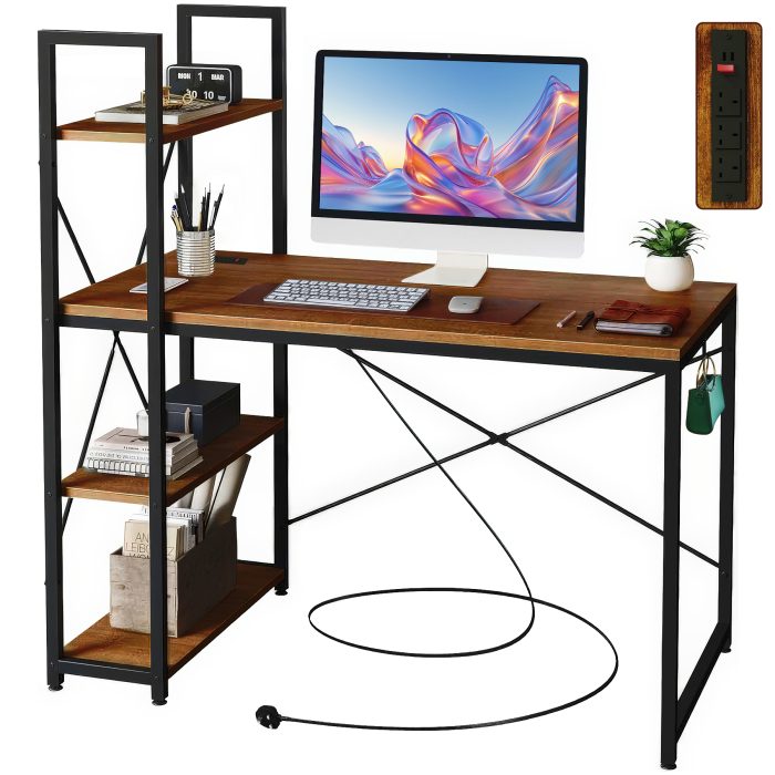 【MODERN DESIGN WITH BUILT-IN POWER HUB】 Elevate your workspace with a sleek industrial design featuring a rustic brown finish that blends style and functionality. The built-in power hub with a 2M power cord includes 3 AC outlets and 2 USB ports, letting you simultaneously charge up to 5 devices for a streamlined and connected setup.